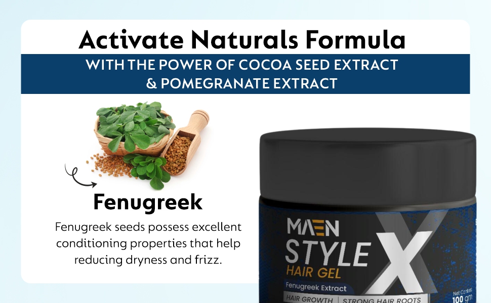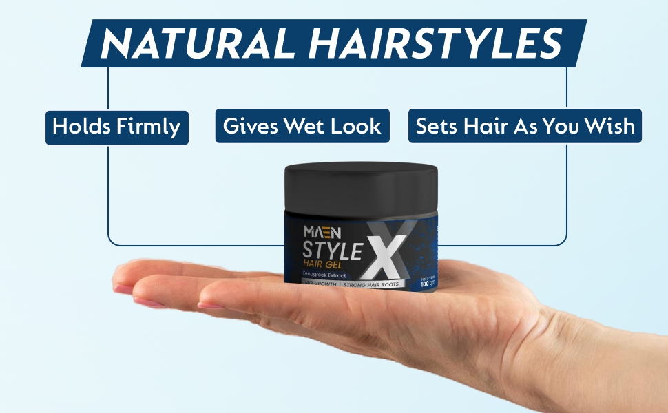 - Natural Ingredients: Style-X hair gel for Men contains only natural plant-based ingredients & no harmful chemicals. It is enriched with the goodness of Almonds, Fenugreek, Biotin, Coconut, etc.
